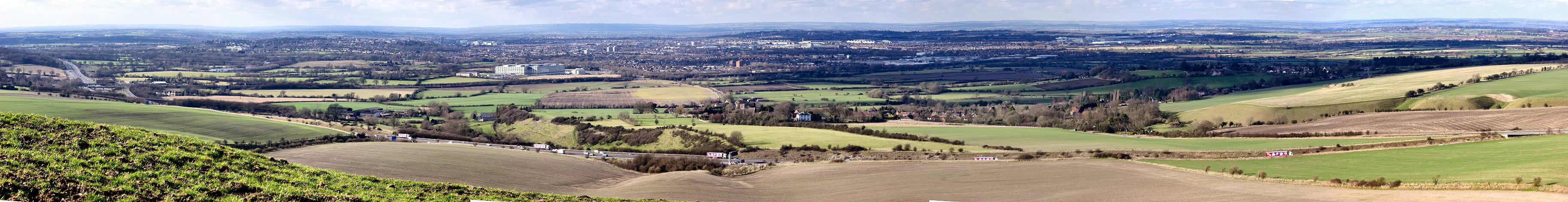 In early March 2003 I went to Liddington Castle from where you have a very good view over Swindon. It wasn't as clear as I had hoped for, but good enough to create a few panoramic pictures of the view. On this page I only show small versions of them, just below each picture is a link to a much larger version. Please be aware that these are quite large pictures, they might take a while to download if you have a slow connection.